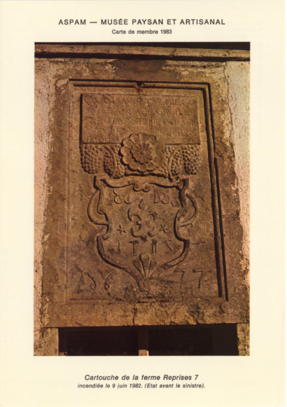 CARTOUCHE DE 1606Cartouche de 1606 de la ferme aujourd'hui détruite, voisine de la ferme des BRANDT Ce cartouche récupéré par l'ASPAM sera conservé dans la ferme des BRANDT, propriété de l'ASPAM. |
