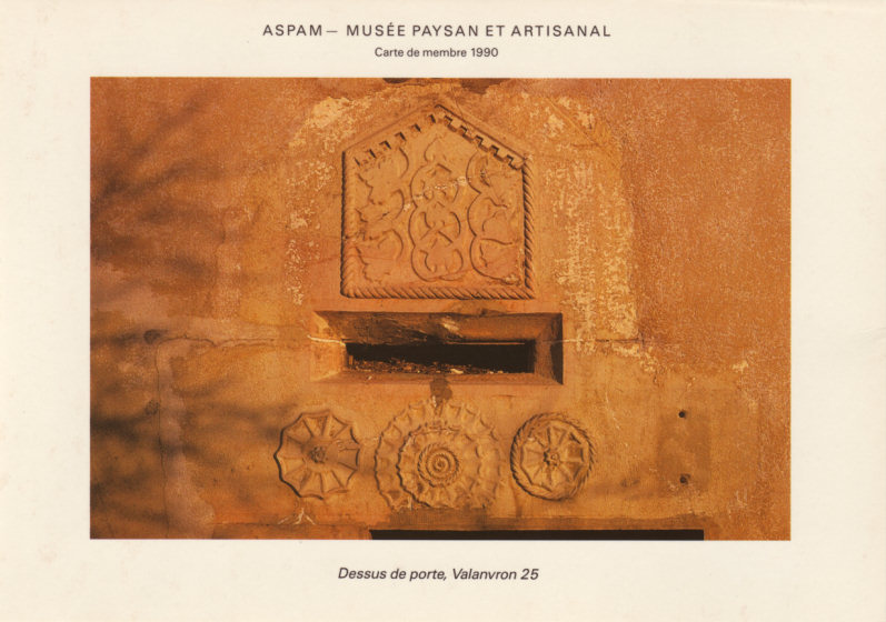 DESSUS DE PORTE, VALANVRON 25Motifs repris de la sculpture romane, XIIe siècle. Partie supérieure: Maison de Dieu avec arbre de vie signifiant espérance de vie éternelle, pampres de vigne, symboles du Christ sauveur. Sur le linteau: le temps terrestre, rosace de l'univers avec, à gauche, roue de la lune, à droite, roue du soleil. |
