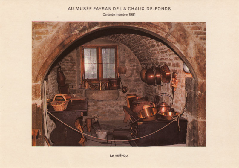 LE RELÉVOU – AU MUSÉE PAYSAN DE LA CHAUX-DE-FONDSLe « relévou », couloir conduisant de la cuisine au «lavoir » où on « relave » la vaisselle. Une modeste fenêtre donne un peu de jour dans la cuisine et fait briller les seilles à eau et autres ustensiles de cuivre, honneur de la maîtresse de maison. |