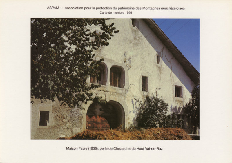 MAISON FAVRE (1636), PERLE DE CHÉZARD ET DU HAUT VAL-DE-RUZPresque intacte, cette élégante demeure au visage radieux, bientôt quatre fois centenaire, peut prétendre au titre de reine du Val-de-Ruz parmi les maisons paysannes du XVIIe siècle. Monument à voir et surtout à protéger! |