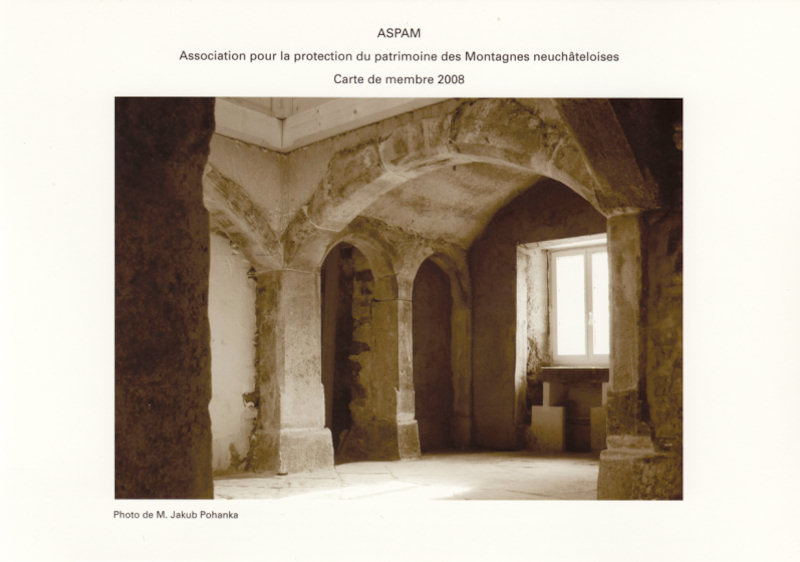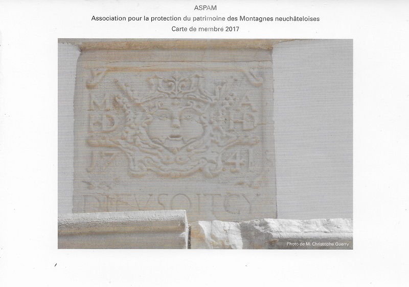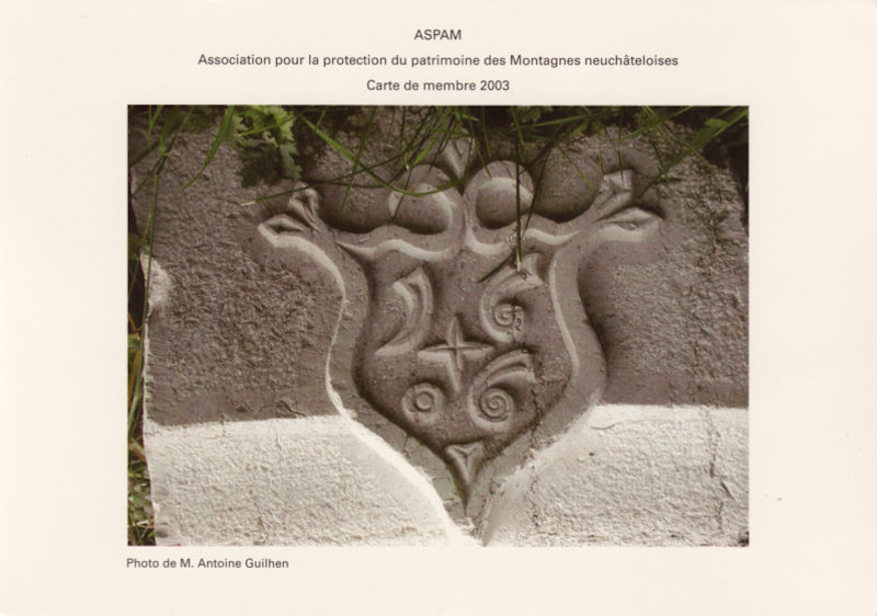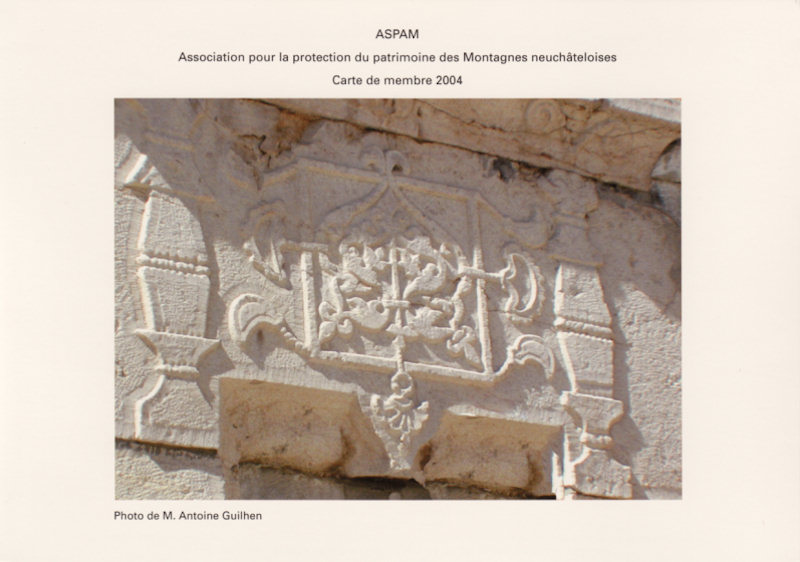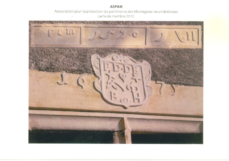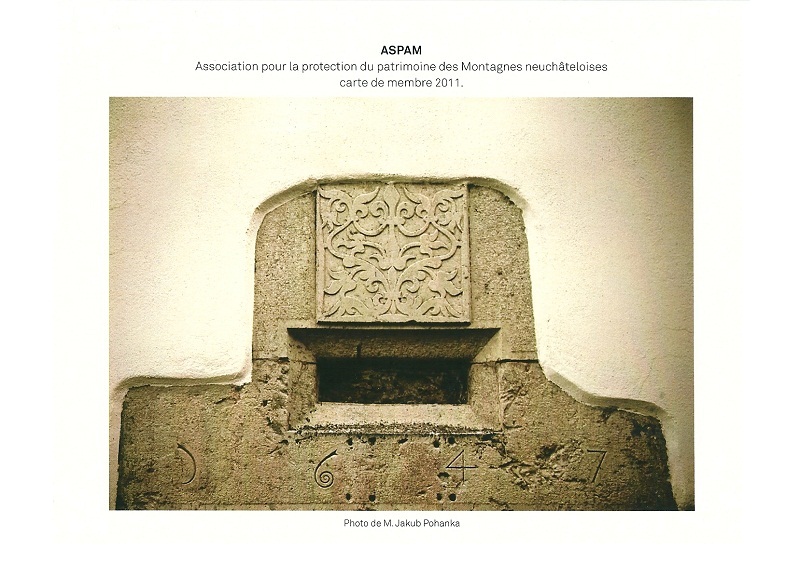 FERME "PIERRE DROZ-DIT-BUSSET", EPLATURES 58, LA CHAUX-DE-FONDSOn peut lire sur le linteau de la porte sud l'inscription PECM (Paix en cette maison) ainsi que les dates 1590 et 1611. Le linteau de la fenêtre de la belle chambre porte la date de 1675, et en son milieu un cartouche qui renferme les initiales PDDB (Pierre Droz-dit-Busset) ainsi que le rasoir et la lancette de barbier-chirurgien. Nous avons groupé ces deux inscriptions sur la carte de membre 2010. Nous avons choisi ce sujet parce que la sauvegarde de cette ferme, qui appartient à la Commune de la Chaux-de-Fonds, est l'un des objectifs actuels importants de l'ASPAM. Photos: Jakub Pohanka |