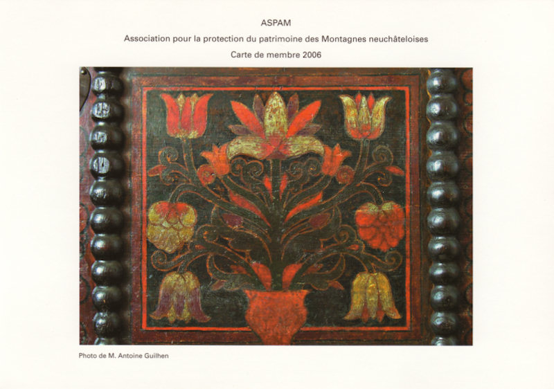 MOTIF FLORAL D'UN BAHUTMotif floral (tulipes et pivoines) d'un bahut de la fin du XVIIe, début XVIIIe, provenant du Crêt-du-Locle. |