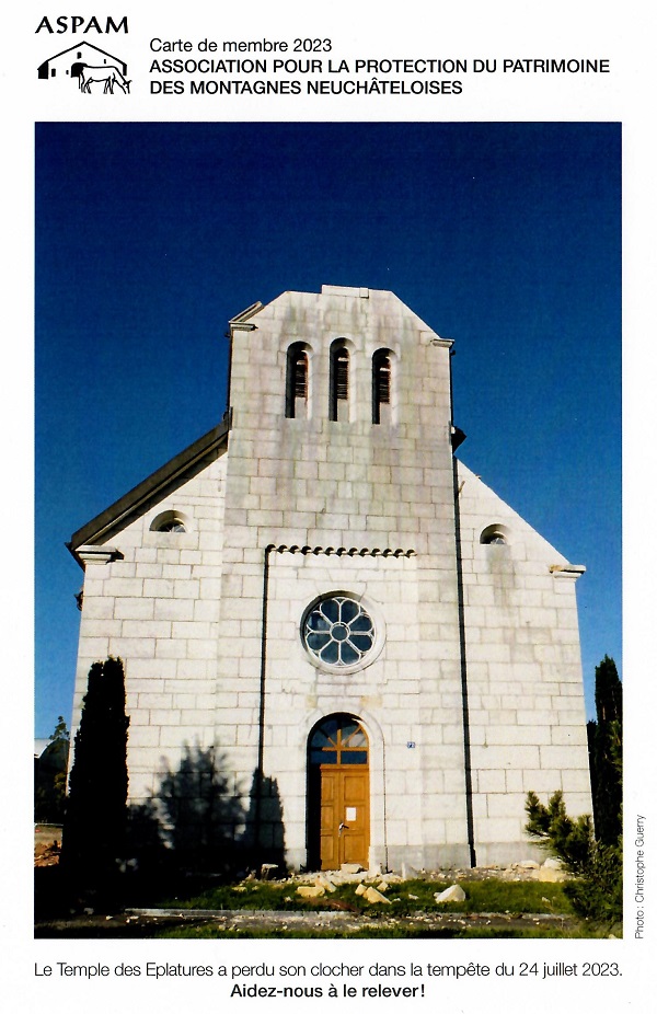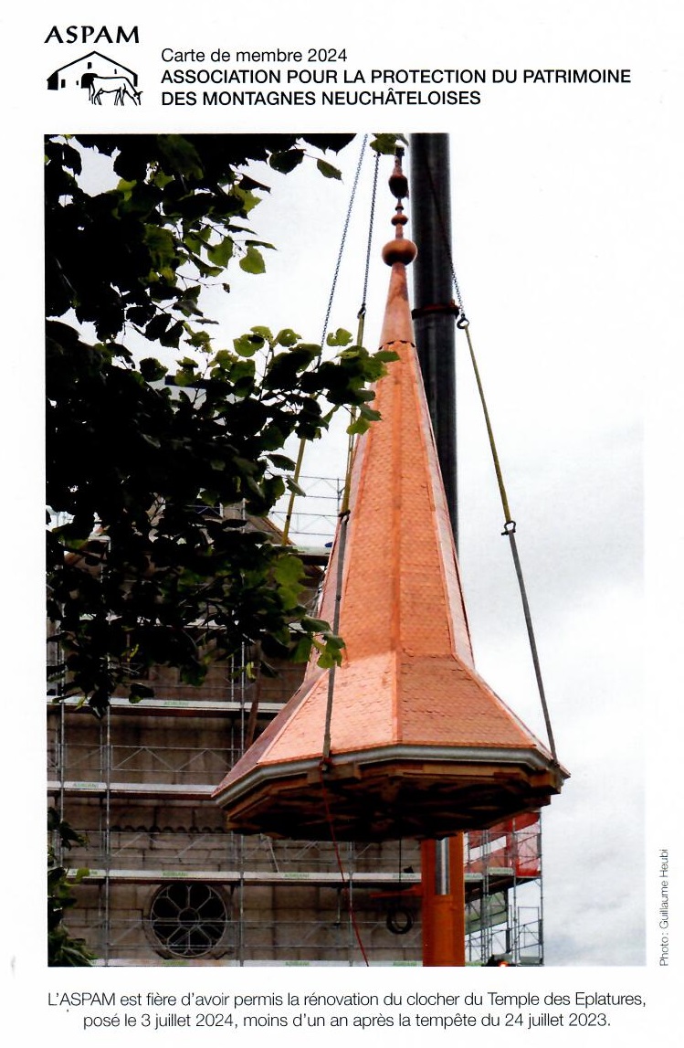 Temple des EplaturesL'ASPAM est fière d'avoir permis la rénovation du clocher du Temple des Eplatures, posé le 3 juillet 2024, moins d'un an après la tempête du 24 juillet 2023. |