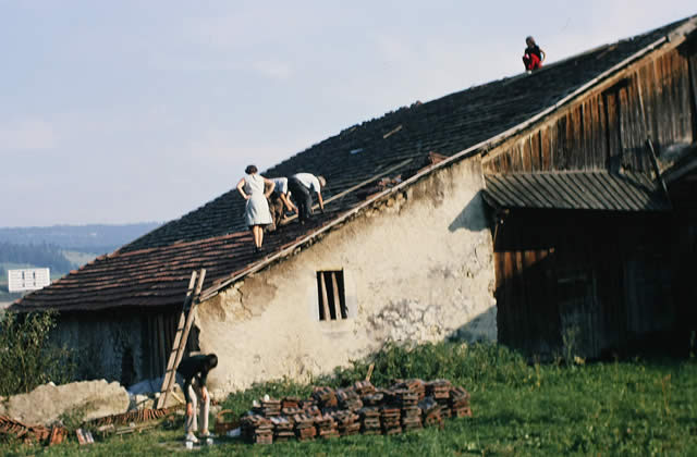 est mis sur pied avec l’aide d’un nombre important de volontaires de tous âges. Il s’agit de renforcer la charpente, de remettre en état le lattage du toit et de le couvrir au moyen de tuiles récupérées, ceci avec l’accord de la Commune. A son retour le même soir, le propriétaire constate avec force mauvaise humeur qu’il est à son tour mis devant un fait accompli : la ferme est hors d’eau